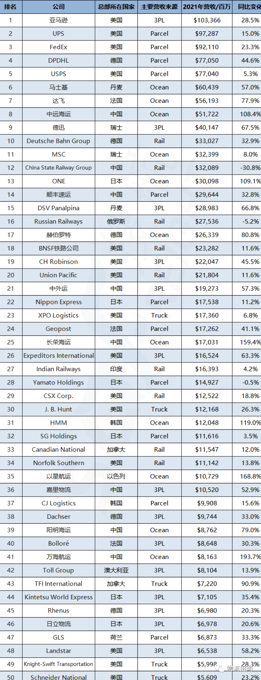 據(jù)了解,全球50大運輸供應(yīng)商2021年的總收入達到了1.29萬億美元,同比增長31.4%,創(chuàng)歷史新高。50家企業(yè)中有47家實現(xiàn)了年度增長。