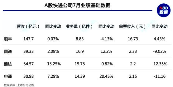 8月18日晚間,A股4家快遞公司發(fā)布7月業(yè)績(jī),綜合各家披露的數(shù)據(jù)可以看到,快遞頭部企業(yè)的下半年業(yè)績(jī)競(jìng)爭(zhēng)愈演愈烈,其中,申通快遞營(yíng)收和業(yè)務(wù)量的增速繼續(xù)領(lǐng)先,圓通速遞穩(wěn)坐加盟制老二的寶座,韻達(dá)股份雖然業(yè)績(jī)難止下滑,但是其與申通的業(yè)務(wù)量差距正在拉大,追趕動(dòng)作明顯。