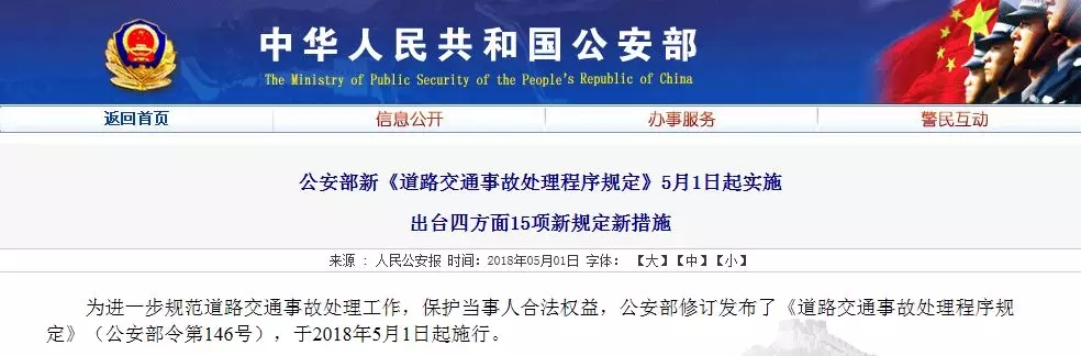 為進(jìn)一步規(guī)范道路交通事故處理工作,保護(hù)當(dāng)事人合法權(quán)益,日前,公安部修訂發(fā)布了《道路交通事故處理程序規(guī)定》(公安部令第146號),該規(guī)定已于2018年5月1日起正式施行。