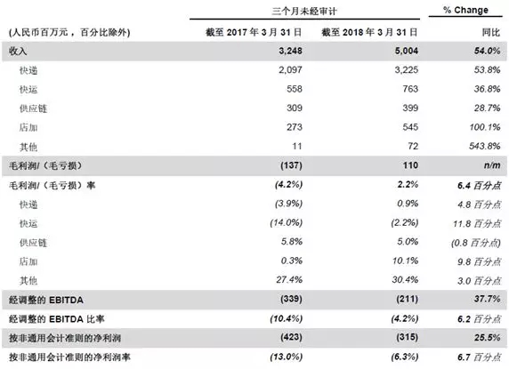 5月10日,百世集團公布2018年第一季度未經審計財務業(yè)績:一季度總收入50.04億元人民幣,同比增長54%;毛利潤1.1億元人民幣,與去年同期相比提升6.4%。