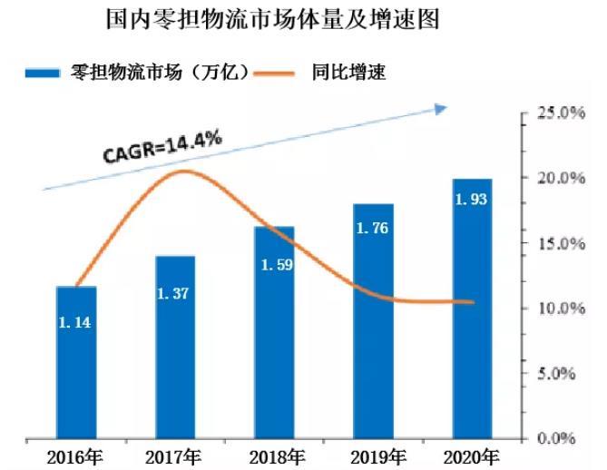 專家預(yù)測,到2020年,零擔(dān)物流(即專線物流)行業(yè)市場體量將達到近2萬億元。從2016年開始,整個市場都在以10%以上的速度在增長,發(fā)展前景十分廣闊。